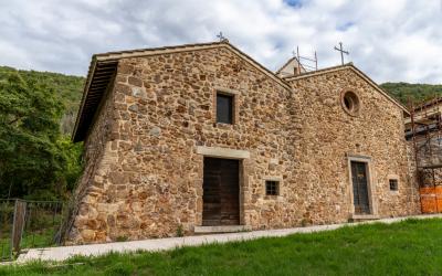 L’origine del Santuario è legata al nome del Padre Zenobi Simoni da Pescia, che dimorando al Santuario di Cibona in cellette molto umide ed anguste in prossimità della cappella della Madonna, si era gravemente ammalato. Qualche anno dopo, recuperata la salute decise di trasferire nella nuova chiesa l’immagine miracolosa della Madonna di Cibona. Successivamente trovò sul Monte Roncone un sito che con il benestare degli appaltatori delle miniere di Allume, eresse alcune piccole stanze per gli eremiti, con una piccola edicola in onore di Maria Santissima. Nacque quindi il nuovo santuario nel 1650. A pochi passi dalla piccola chiesa si apriva l'orto dell'eremita, destinato a camposanto dal 1872 al 1883 e poi divenuto "Parco della rimembranza", in ricordo degli Allumieraschi caduti nella grande guerra. Sopra l'orto, s'innalza un’altissima rupe che ripara l'eremo dai venti del nord, altre 2 gran rupi stanno ai lati della porta che fa' da corridoio prima di entrare nella spianata.